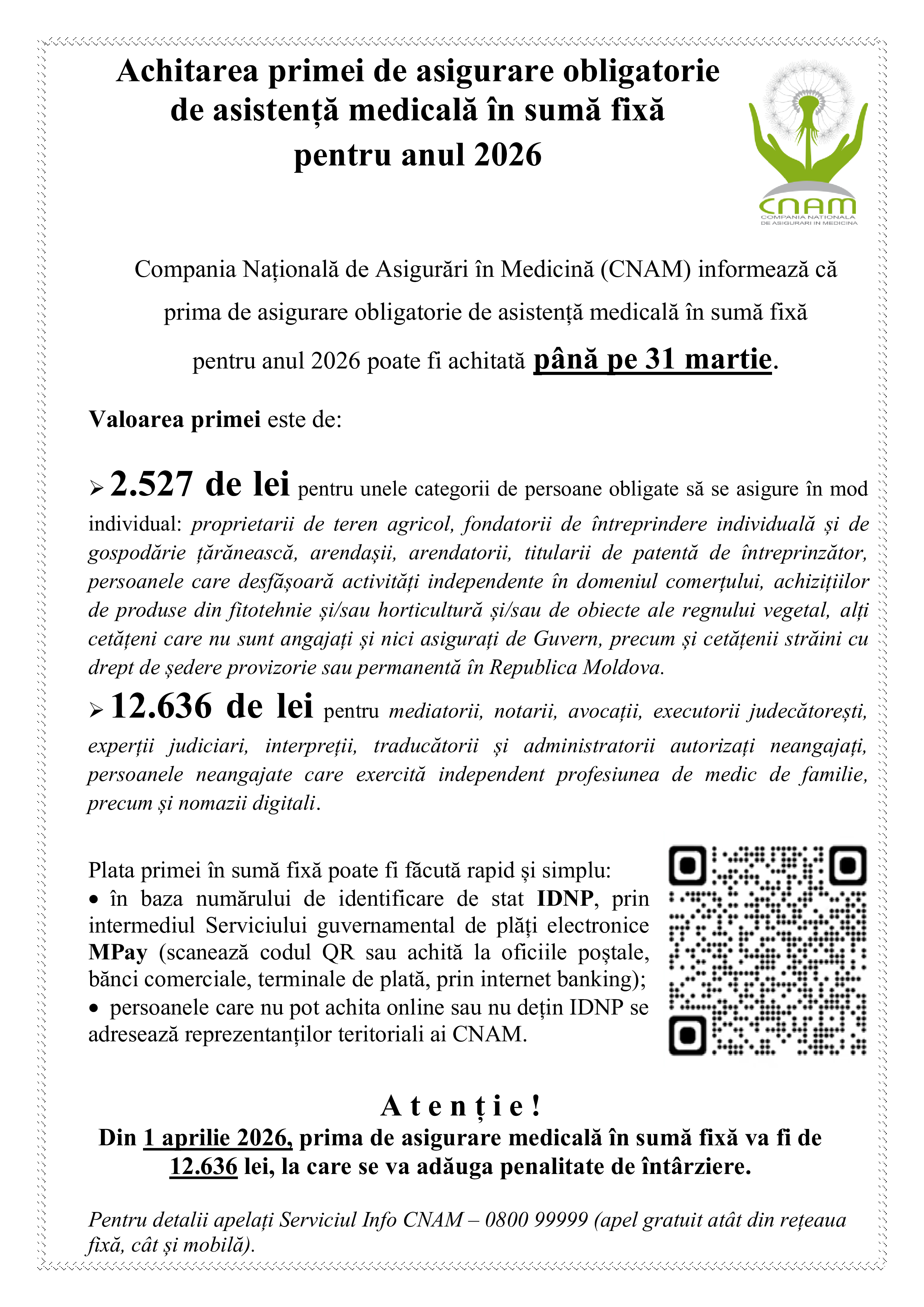 Achitarea primei de asigurare obligatorie de asistență medicală în sumă fixă pentru anul 2026 Articole INFORMAȚII UTILE 16 februarie 202616 februarie 2026 Distribuie: