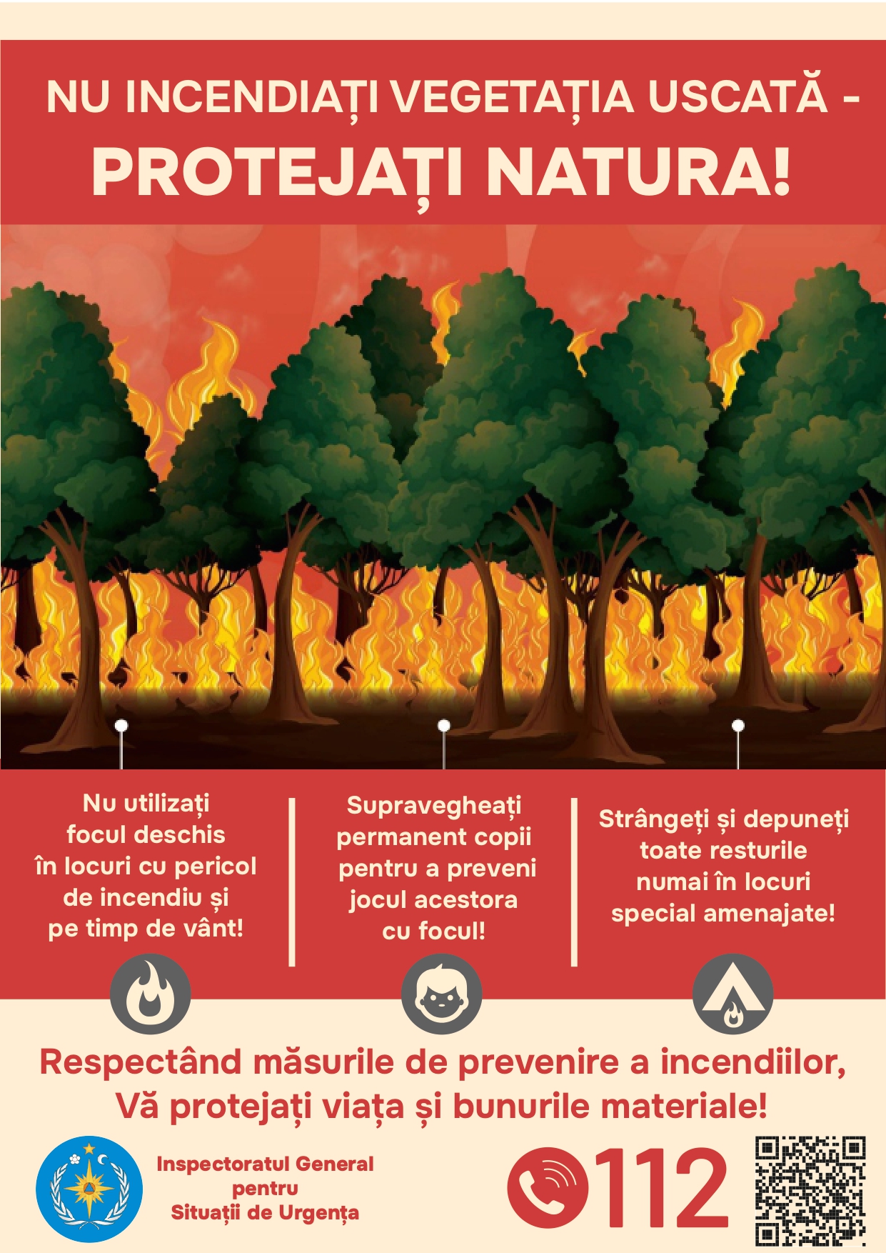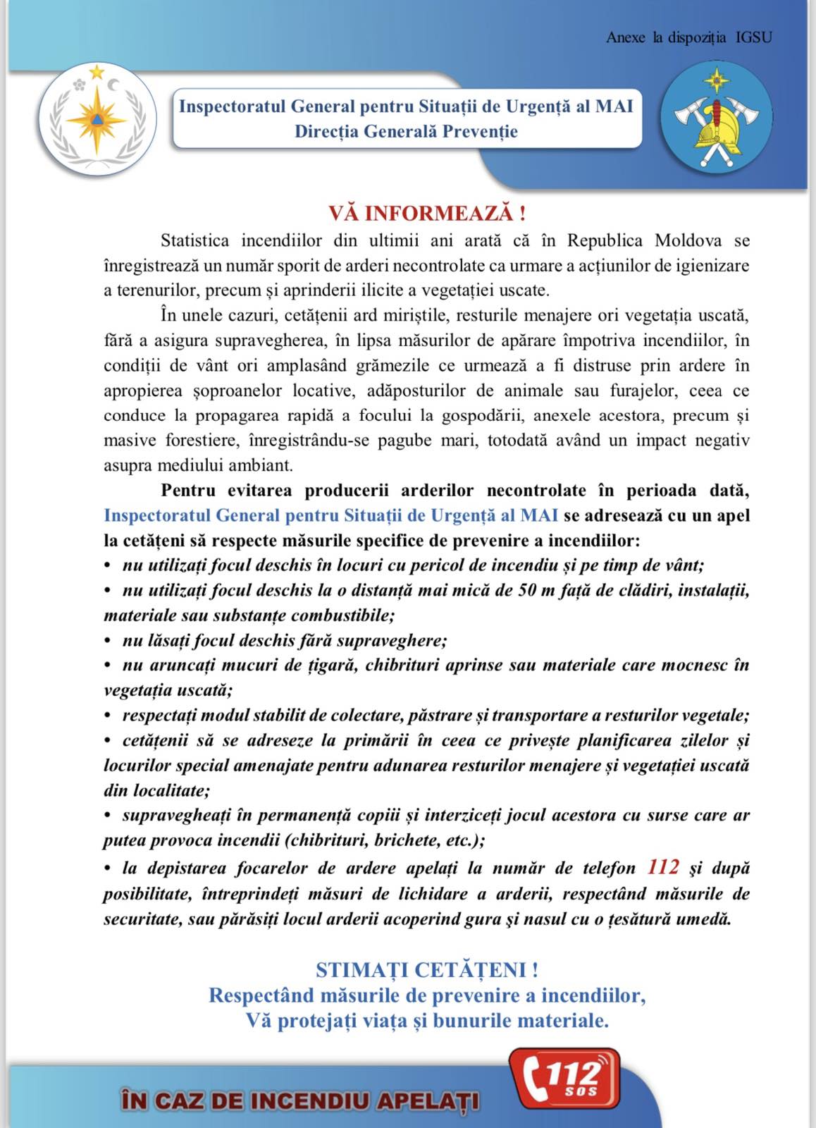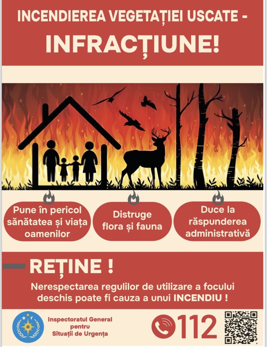Orice început de incendiu în această perioadă trebuie anunţat la serviciul de urgență 112 şi, în caz de necesitate, să acordăm sprijin autorităţilor locale şi pompierilor în stingerea incendiilor de vegetaţie uscată sau a celor din fondul forestier. Cei care nu ţin cont de aceste prevederi şi produc incendii la care este necesară intervenţia pompierilor trebuie să ştie că, potrivit legii, sunt pasibili de amenzi usturătoare.