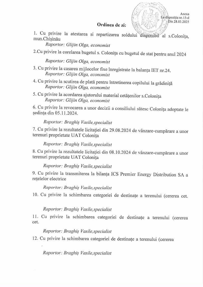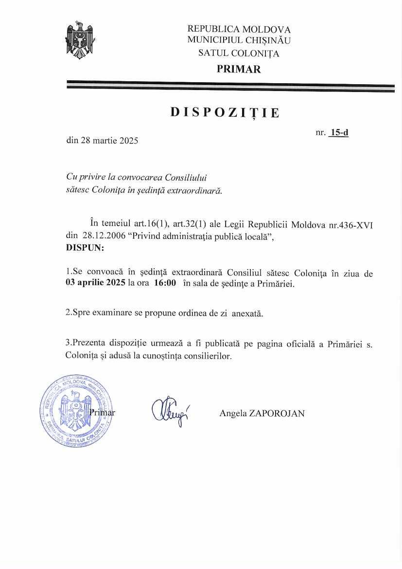 Conform dispoziției primarului s. Colonița nr. 15-d din 28 martie 2025, pentru ziua de joi, 03 aprilie 2025, ora 16:00, în sala de ședință a Primăriei s. Colonița v-a avea loc ședință extraordinară a consiliului sătesc Colonița.