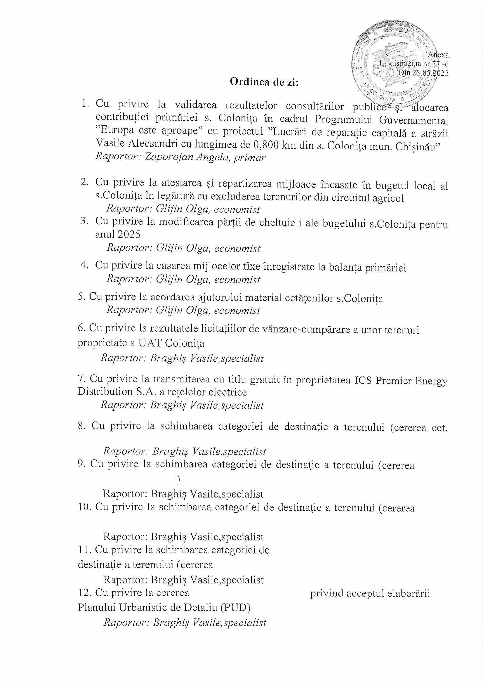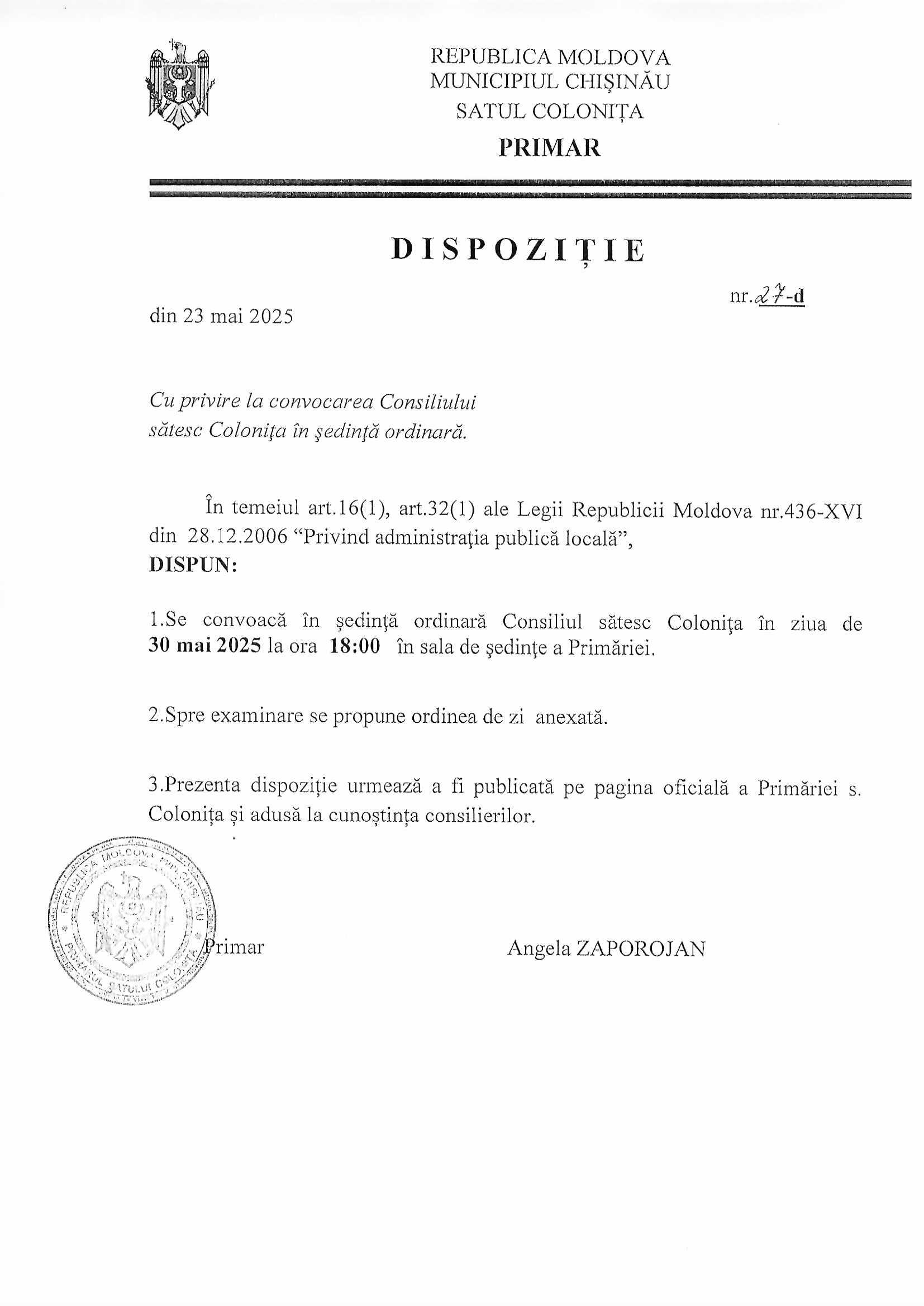 Conform dispoziției primarului s. Colonița nr. 27-d din 23 mai 2025, pentru ziua de vineri, 30 mai 2025, ora 18:00, în sala de ședință a Primăriei s. Colonița v-a avea loc ședință ordinară a consiliului sătesc Colonița.