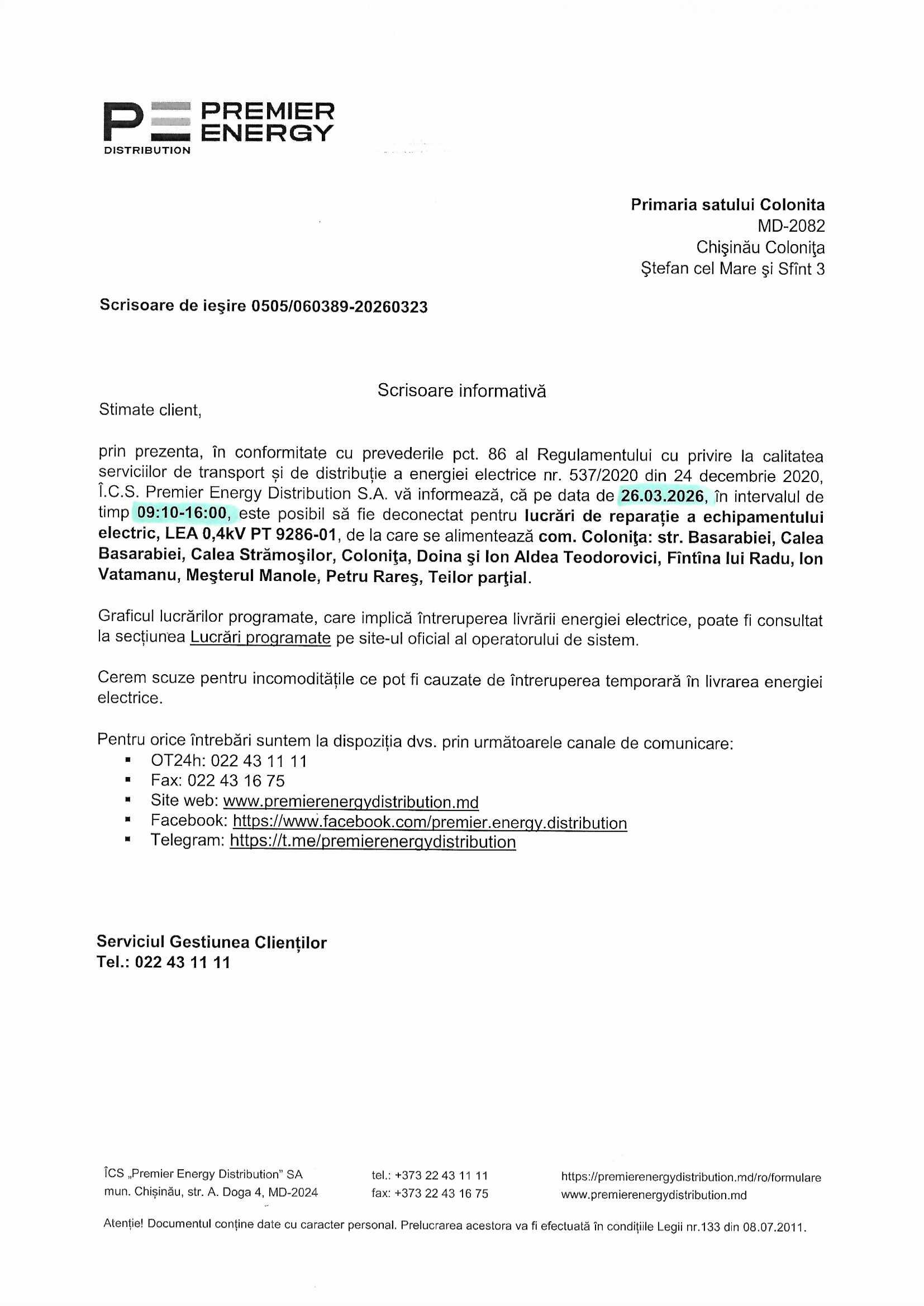 Pentru îmbunătățirea serviciilor prestate clienţilor, Î.C.S. „Premier Energy Distribution” S.A. anunţă că: