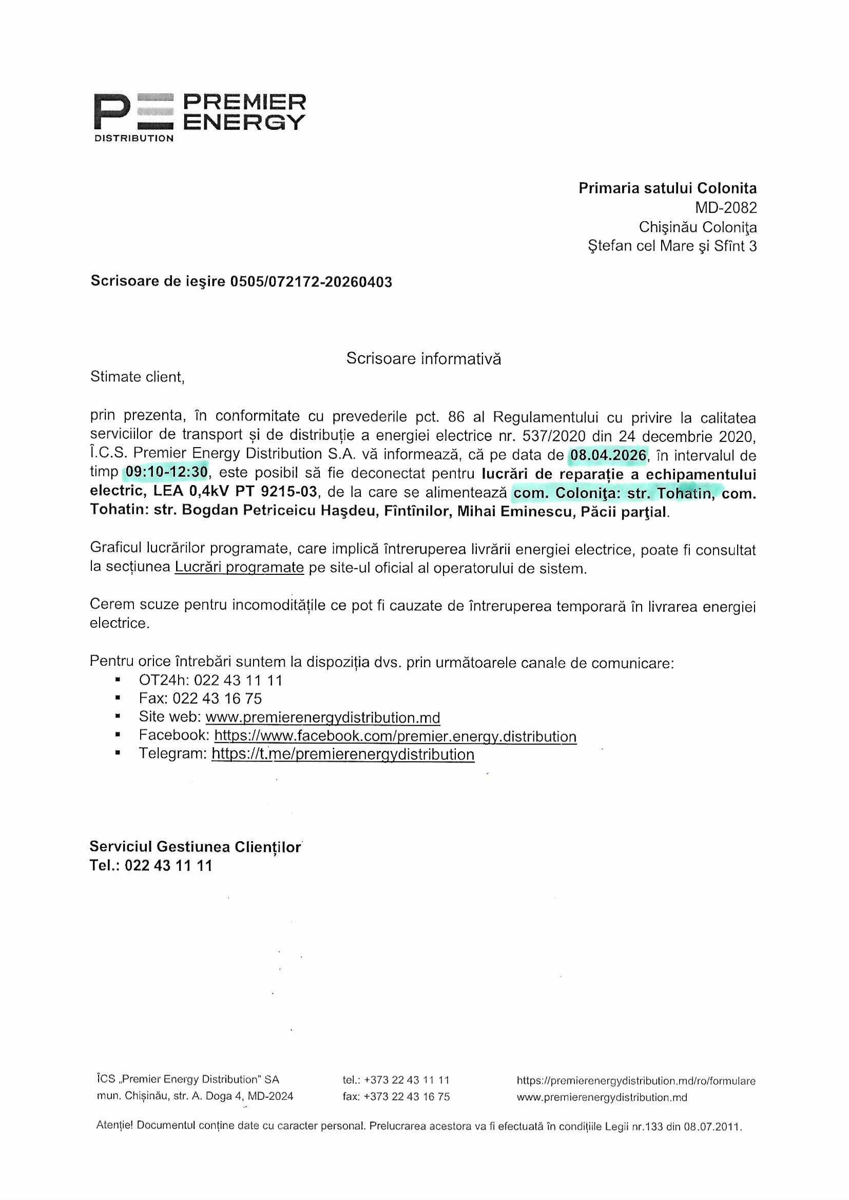 Pentru îmbunătățirea serviciilor prestate clienţilor, Î.C.S. „Premier Energy Distribution” S.A. anunţă că: