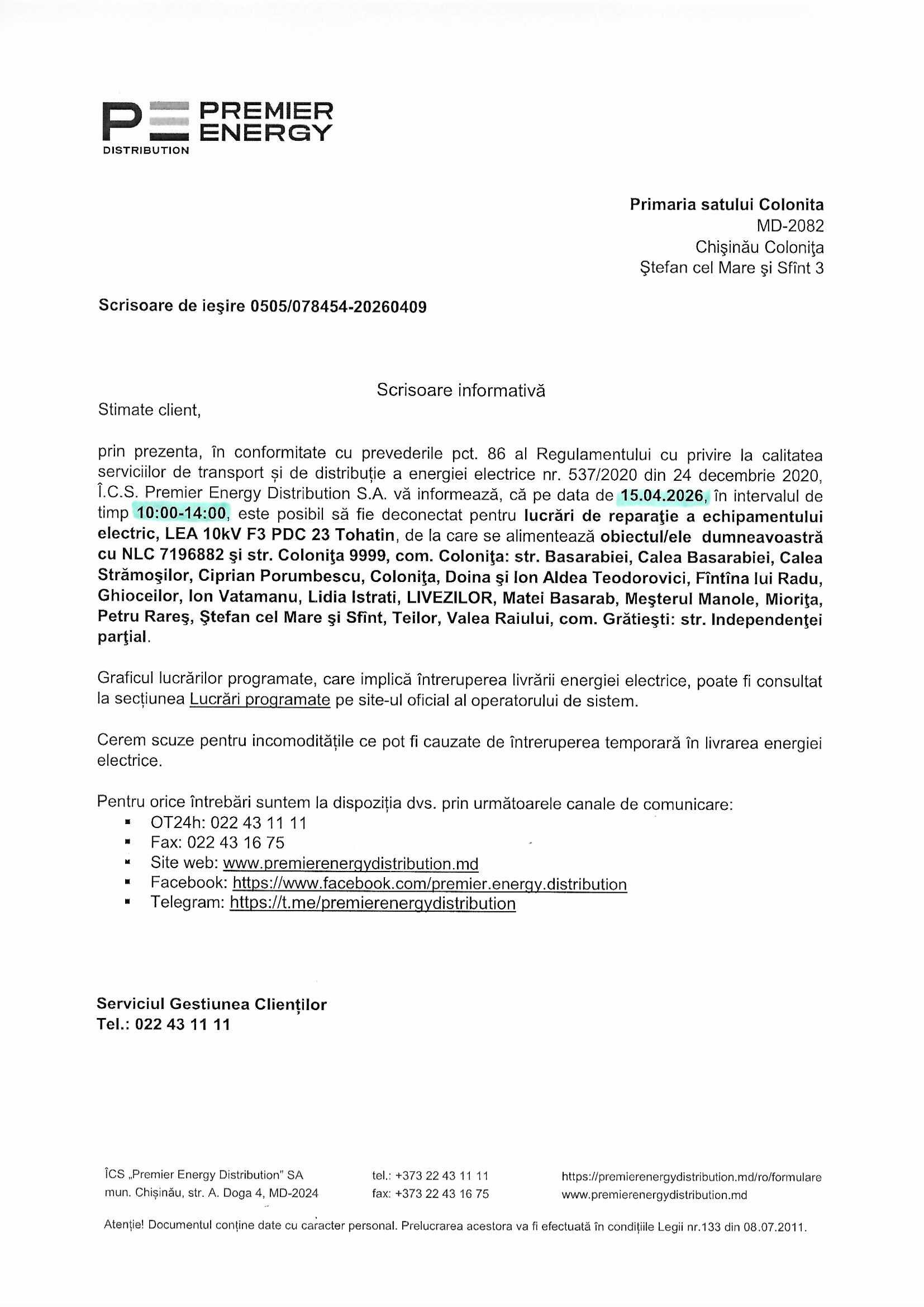 Pentru îmbunătățirea serviciilor prestate clienţilor, Î.C.S. „Premier Energy Distribution” S.A. anunţă că: