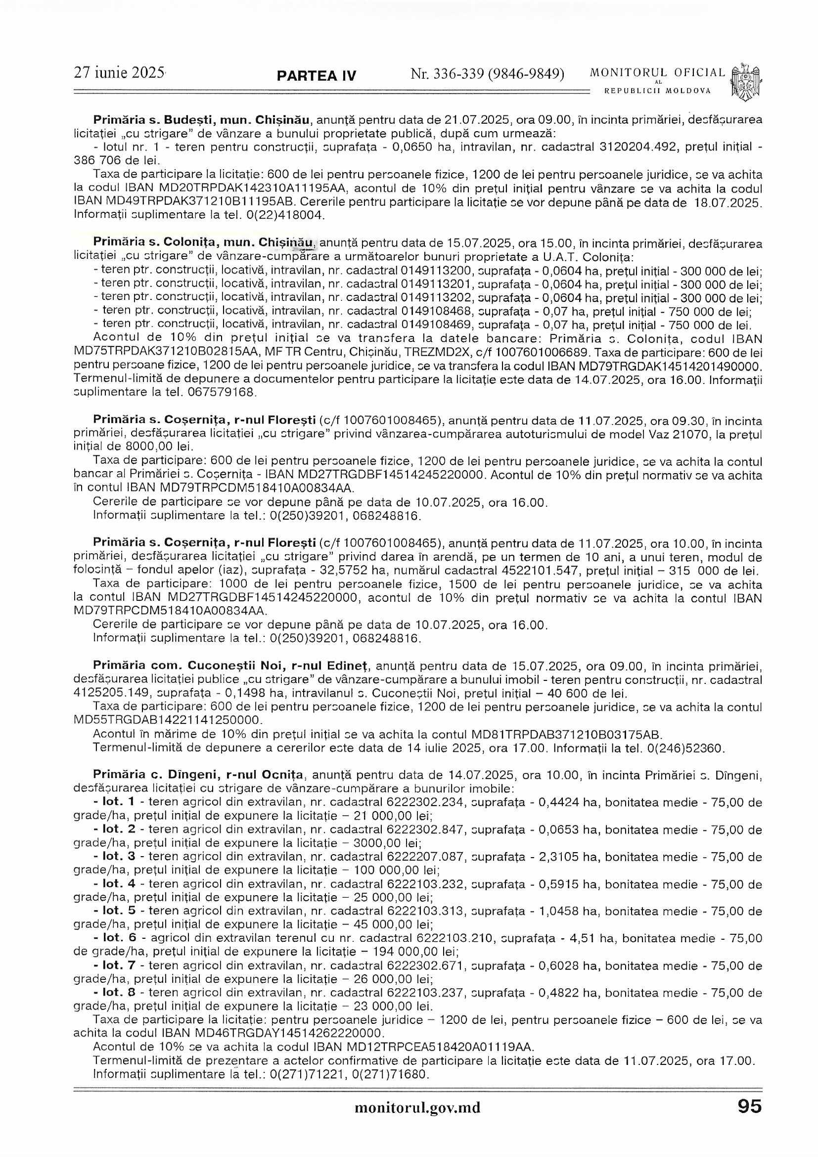 Acontul 10% din prețul inițial se va transfera: Primăria s. Colonița, cod IBAN: MD75TRPDAK 371210B02815AA Ministerul Finanțelor, Trezorăria de Stat TREZMD2X, c/f 1007601006689 . Taxa de participare-600 lei persoane fizice, 1200 lei persoane juridice se va achita la cod IBAN: MD79TRGDAK14514201490000 . Termenul limită de depunere a documentelor pentru participare la licitație este 14.07.2025 ora 16:00. Informații suplimentare la tel. 022579165, 067579168.