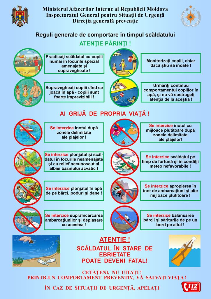 1.Scăldaţi-vă numai în locuri special amenajate, pentru că într-un bazin necontrolat puteţi nimeri în gropi adânci, albia poate fi nămoloasă, cu plante, pietre iar în râu puteţi nimeri în curenţi repezi de apă, cu vârtejuri – situaţii ce pot provoca traume, accidente şi chiar moartea;