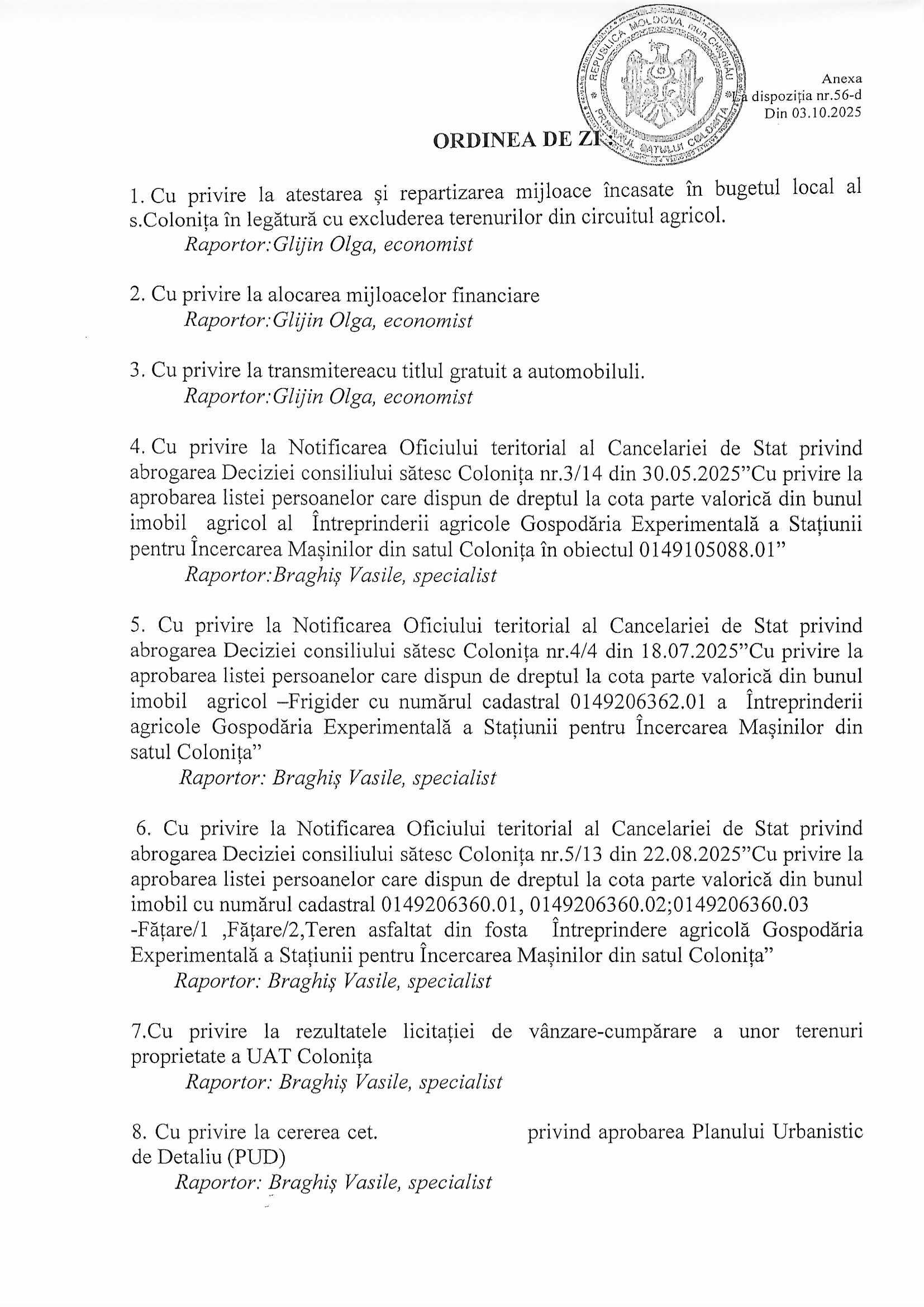 Conform dispoziției primarului s. Colonița nr. 56-d din 03 octombrie 2025, pentru ziua de vineri, 10 octombrie 2025, ora 16:00, în sala de ședință a Primăriei s. Colonița v-a avea loc ședință ordinară a consiliului sătesc Colonița.